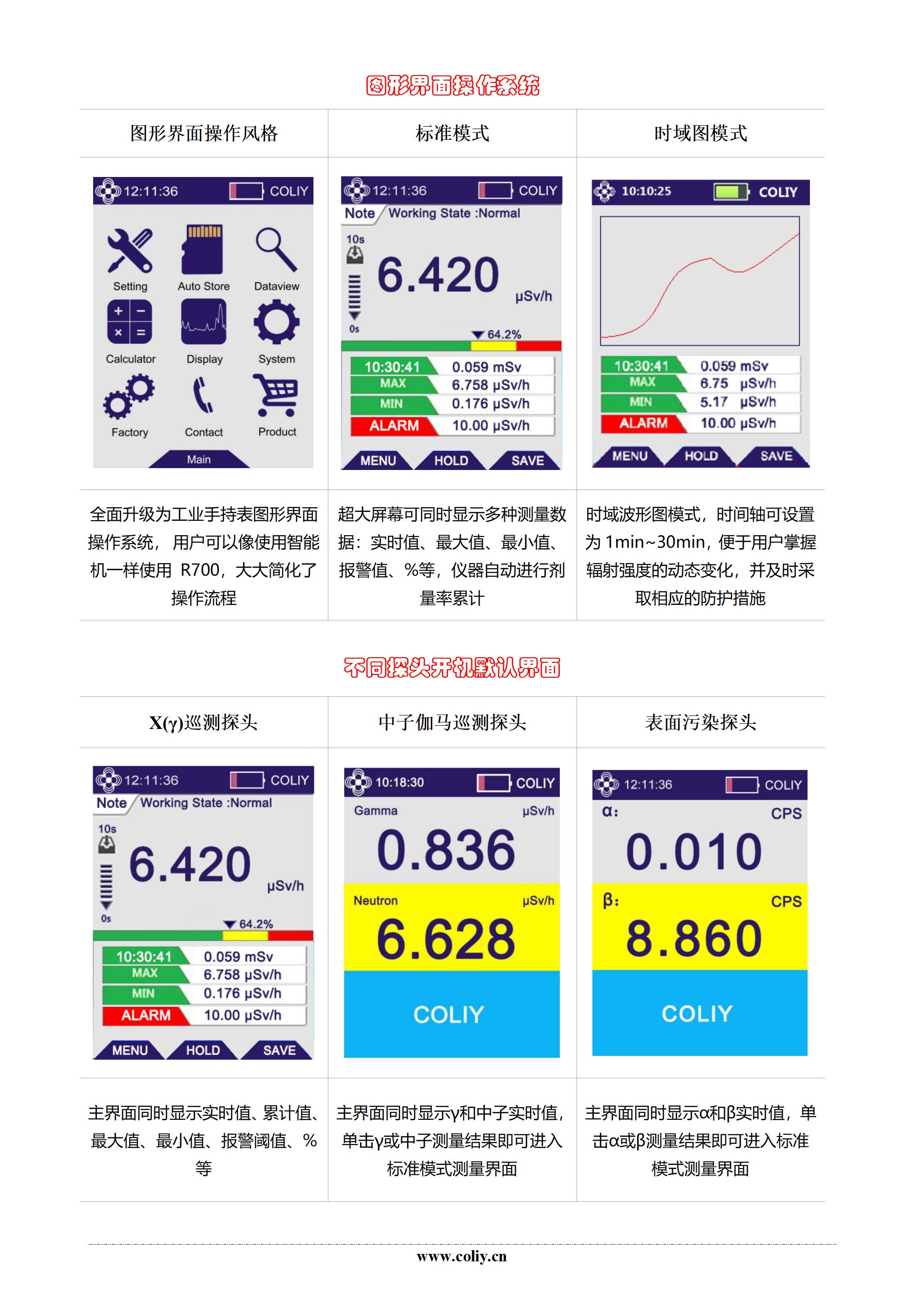 柯雷公司R700型多探头核辐射仪全面升级为柯雷新开发的图形界面操作系统,系统可兼容多种类型探头,用户无需更换主机,直接切换探头即可实现α、β、X、γ和中子射线的测量,满足不同场合需求,大大降低了用户的使用成本;同时仪器支持热插拔,很大程度提升了操作便利性。